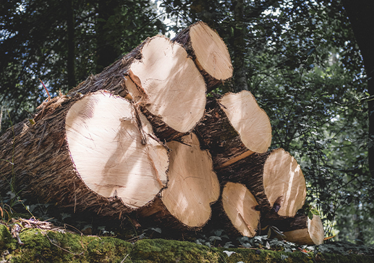 於人造林地採收木材,將圓圓的樹幹直接運送至木材加工廠,