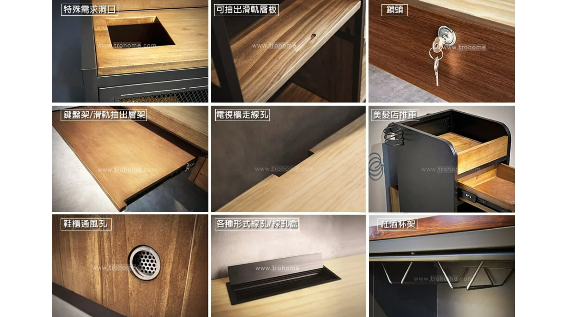 可自由選擇搭配 把手、鎖頭、鐵網、滑軌、紅酒架、杯架等其他配件與樣式。鞋櫃可添加通風排氣孔,電視櫃也能搭配背面走線孔滿足走線需求。