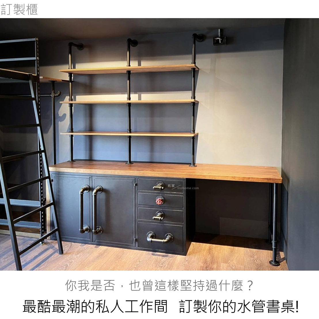 拓家訂製櫃款目前皆採天然實木與鐵件進行製作,目前最多人選擇運用的是紐西蘭硬木松。真材實料的實木,不怕用一兩年後會有人工貼皮翹起或起泡的情形。