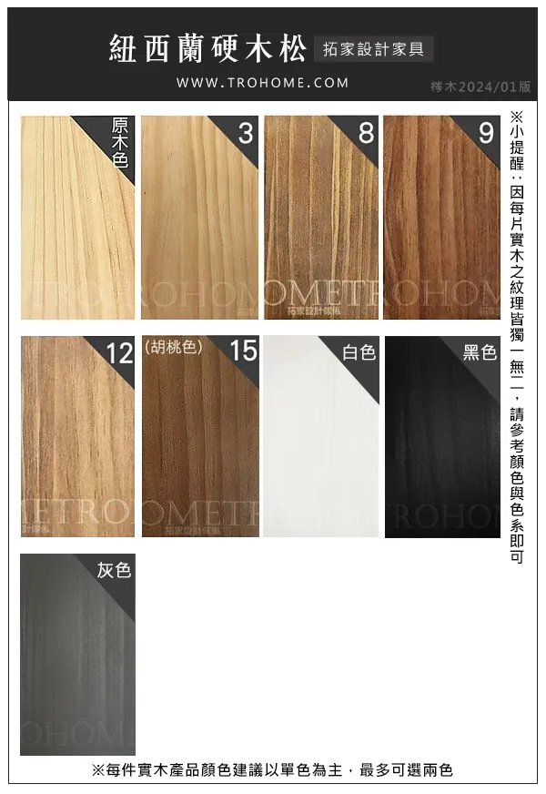 目前共有 紐西蘭硬木松、北美梣木、北美白橡木、北美胡桃木 四種可選,主要是木種本身紋理截然不同,各有特色。