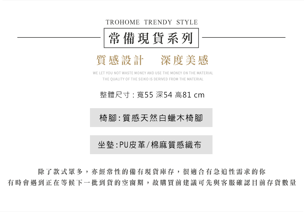 材質:質感天然白臘木椅腳+PU皮革/棉麻質感織布