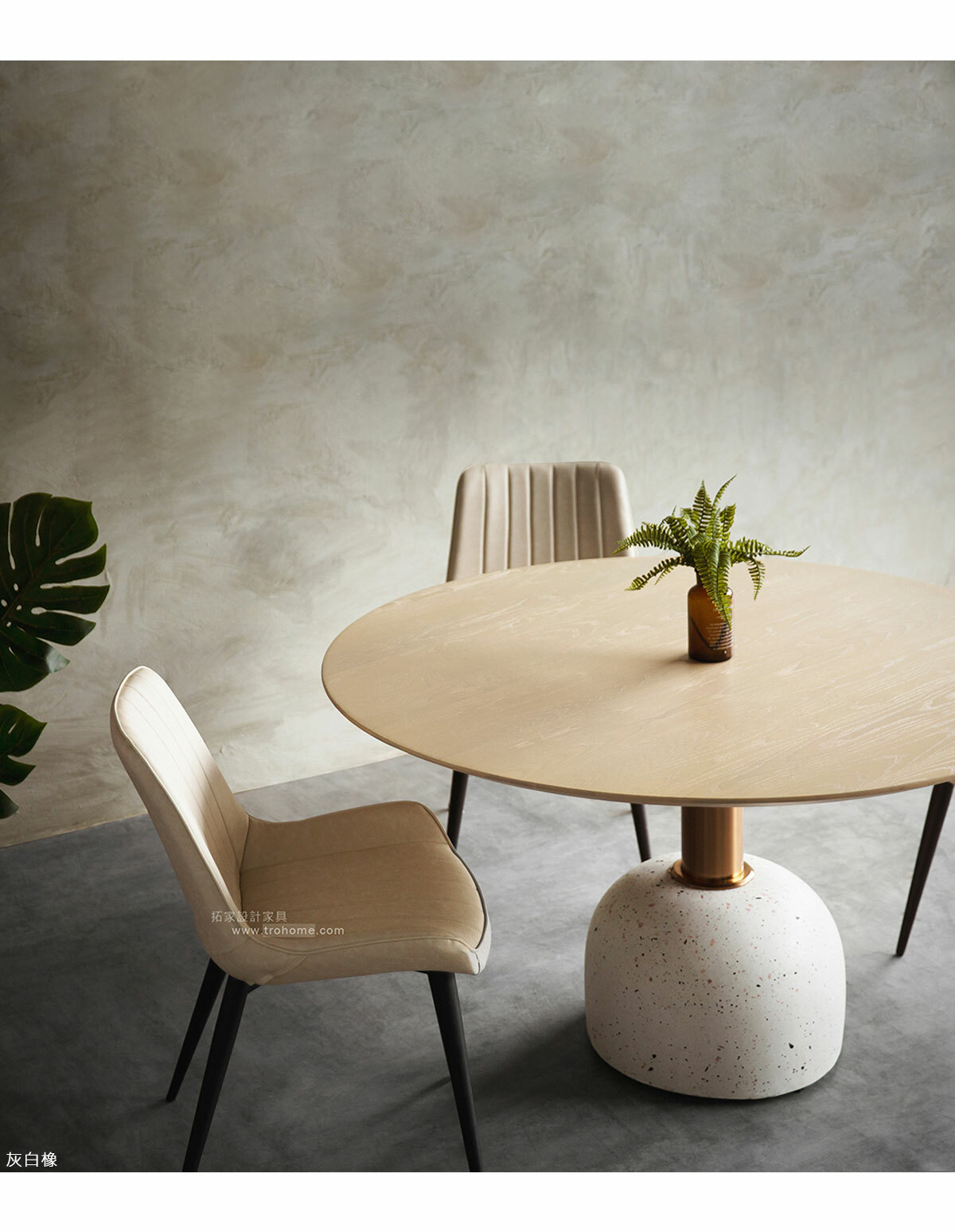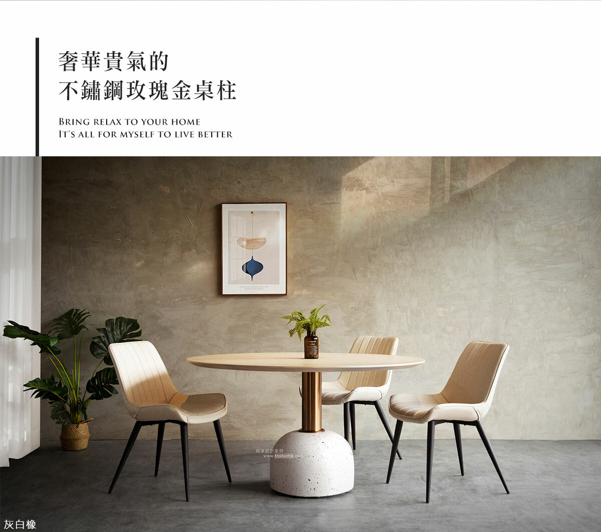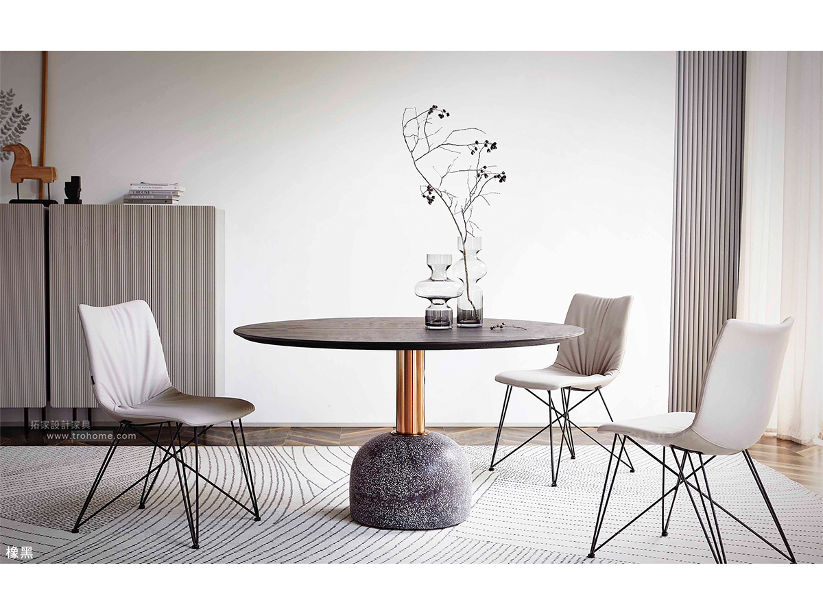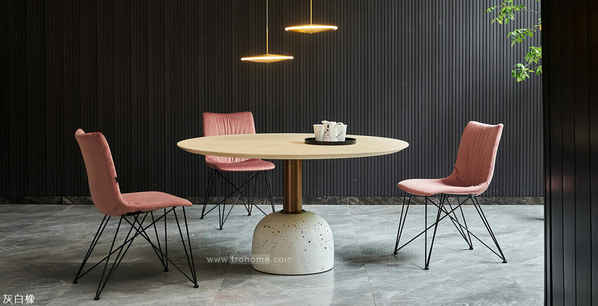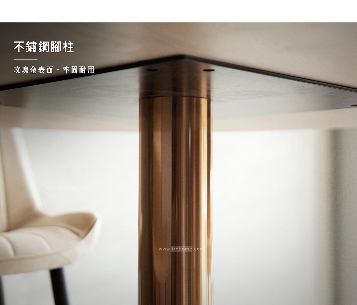 中纖板貼實木皮桌板、不鏽鋼玫瑰金腳柱、水磨石底座