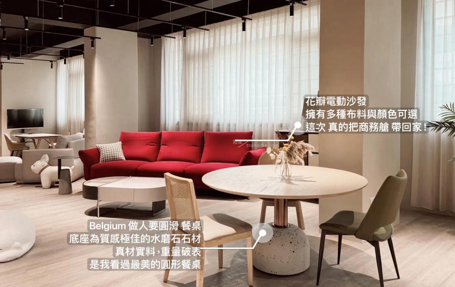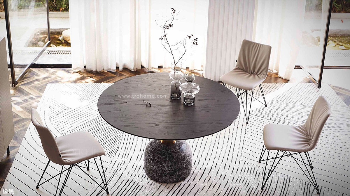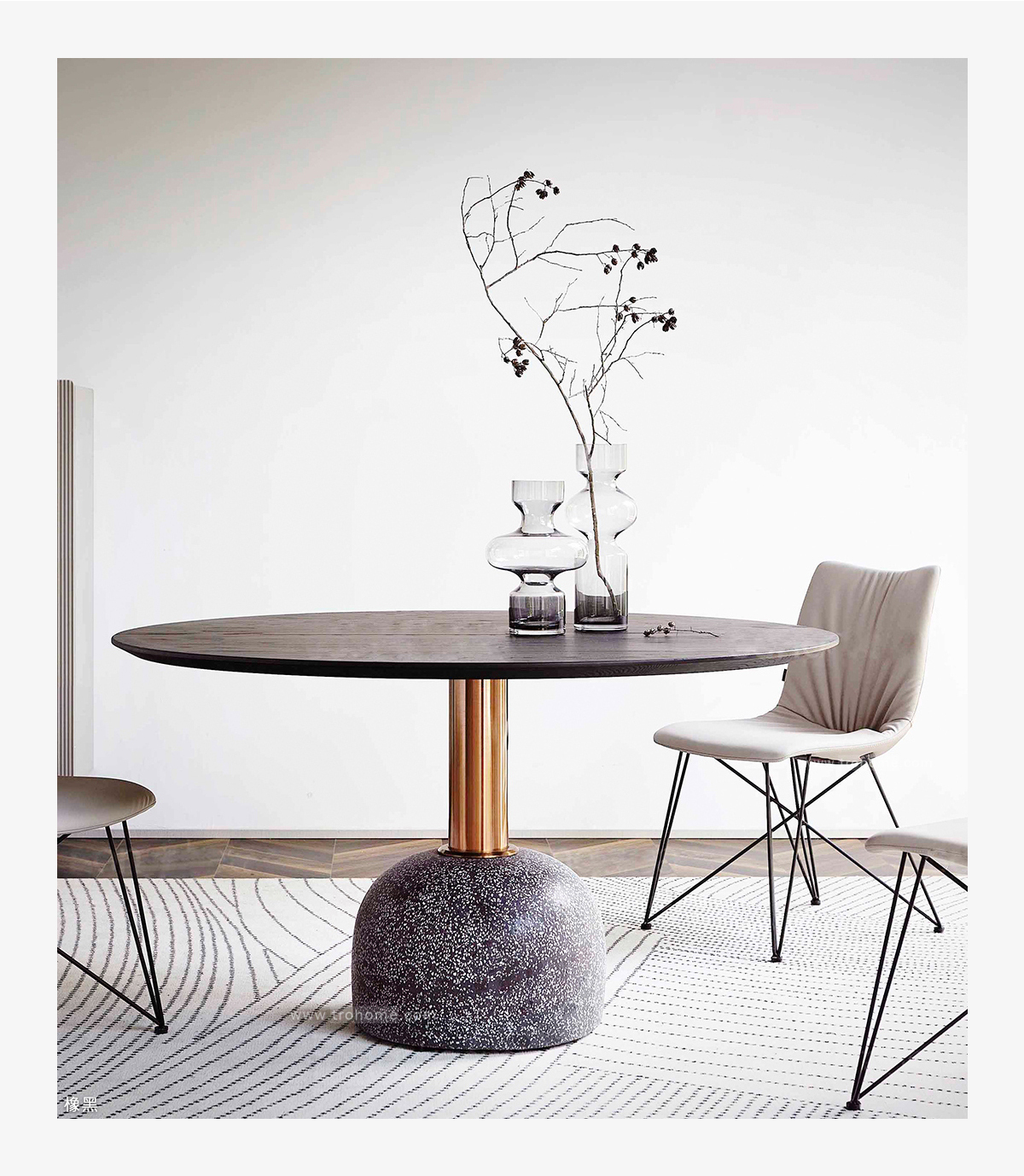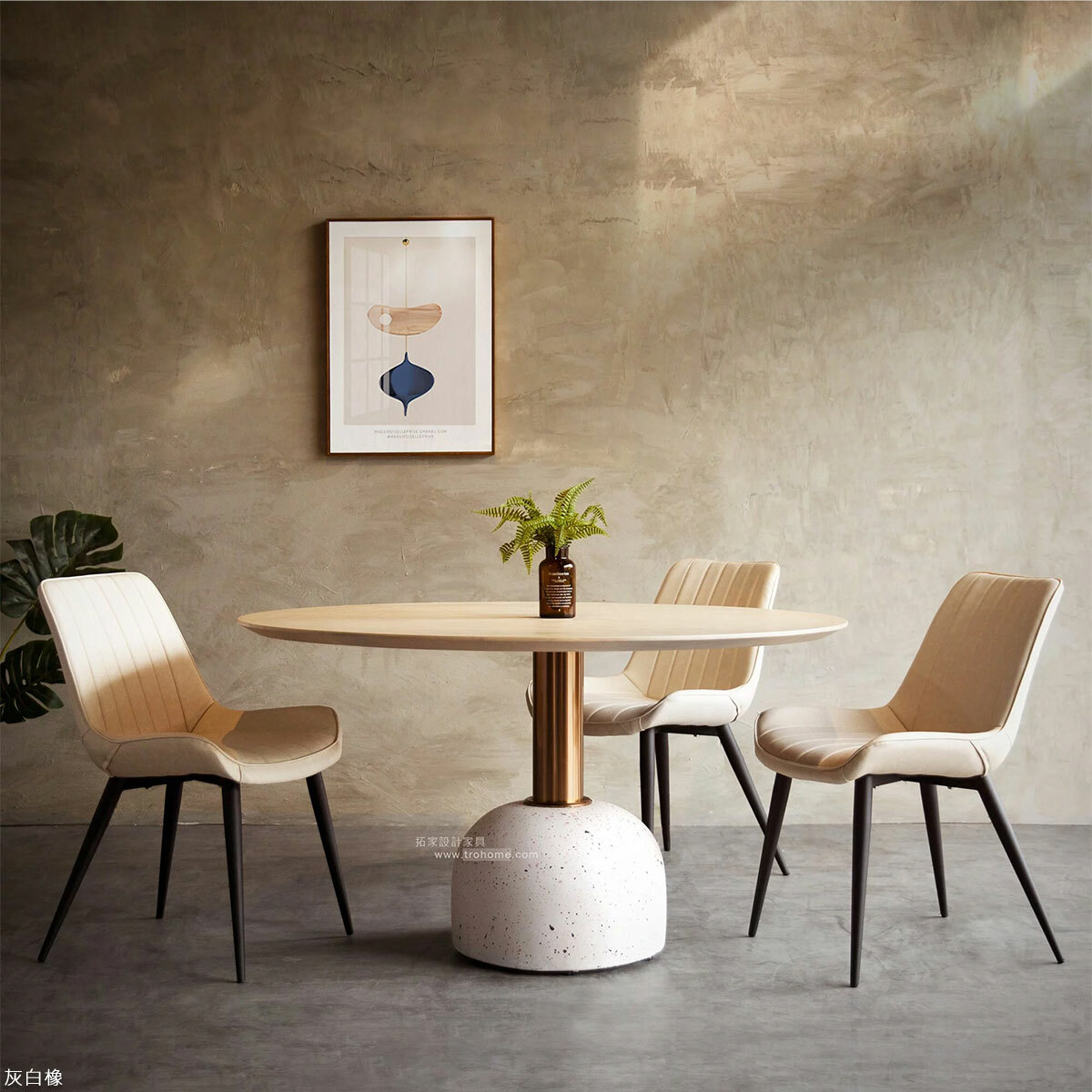 中纖板貼實木皮桌板、不鏽鋼玫瑰金腳柱、水磨石底座