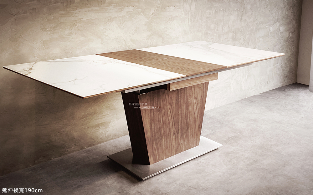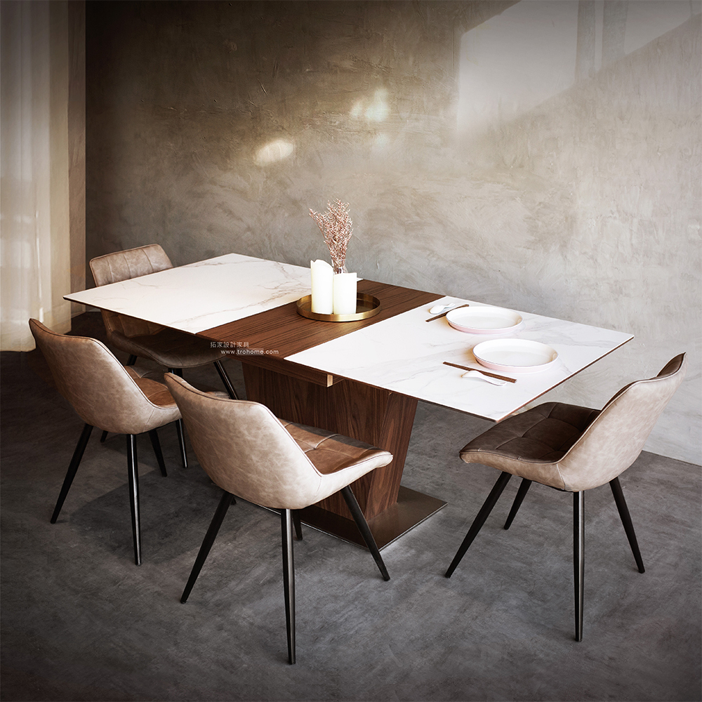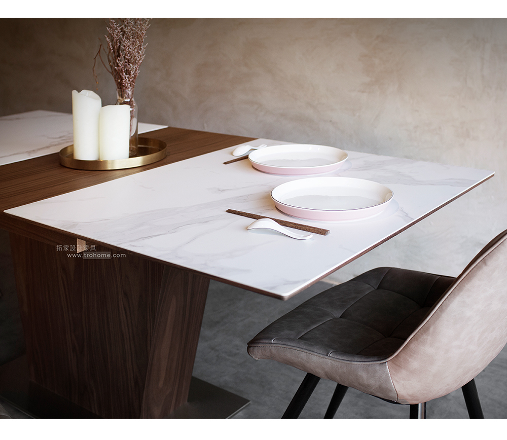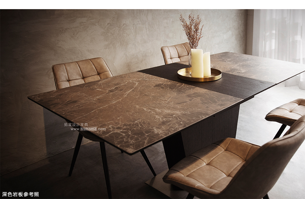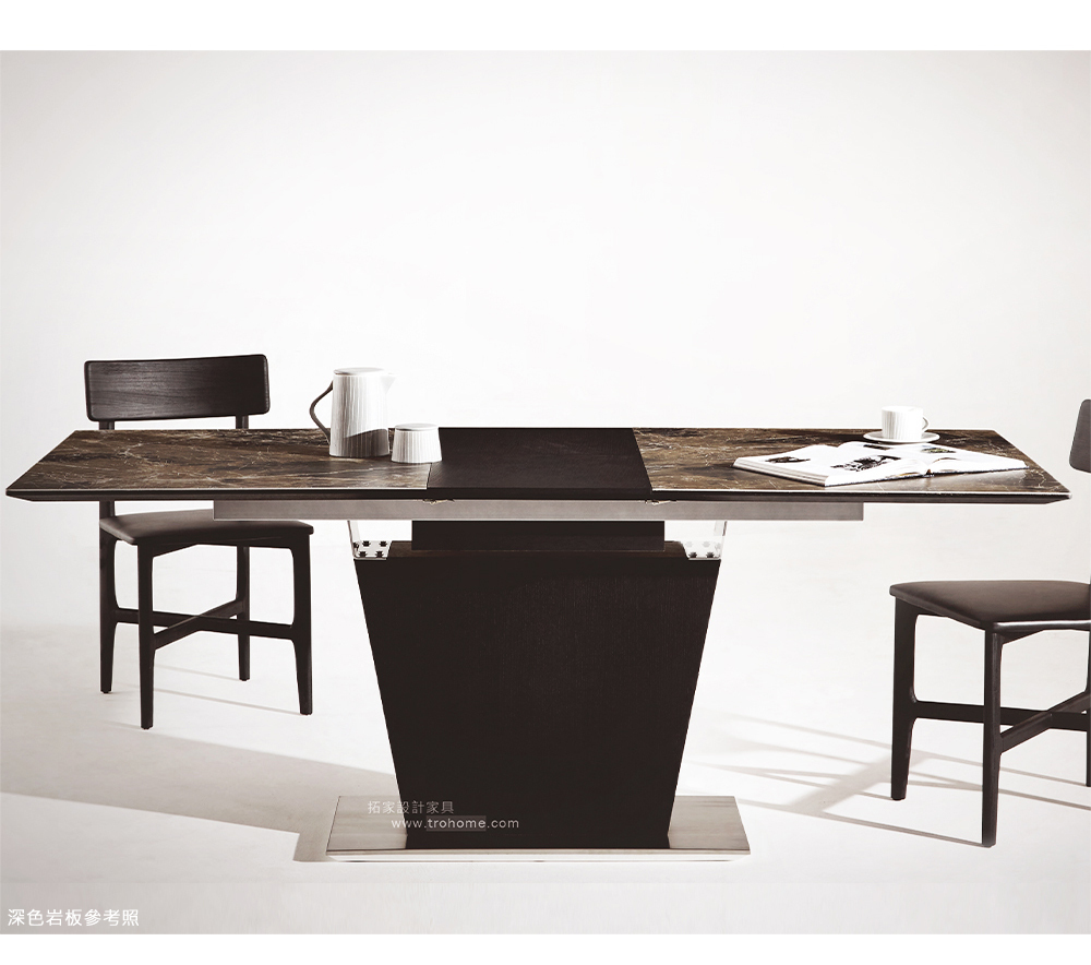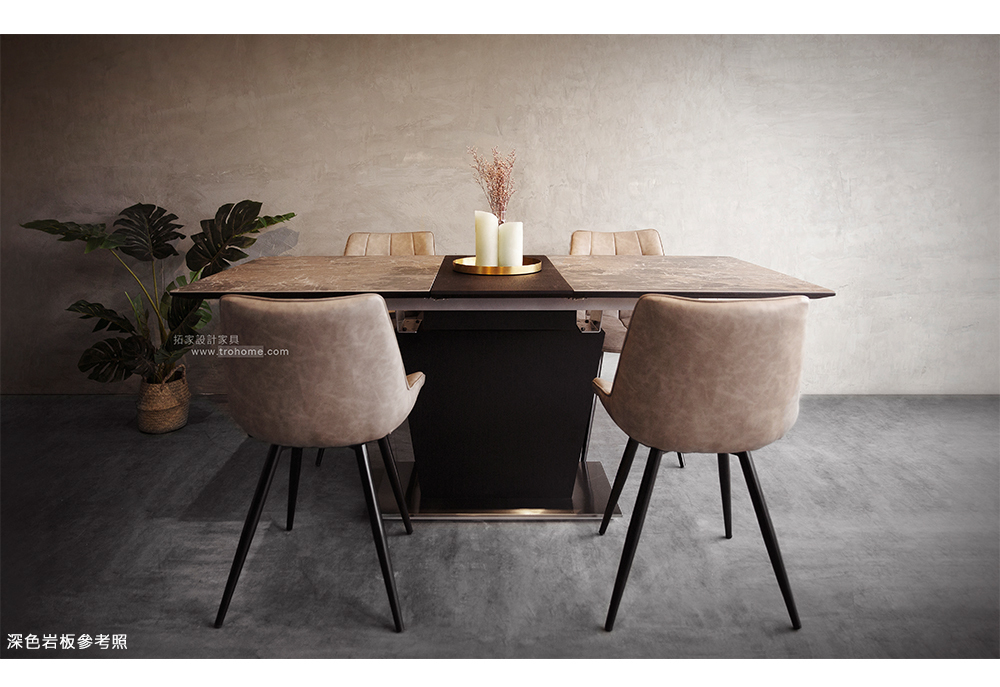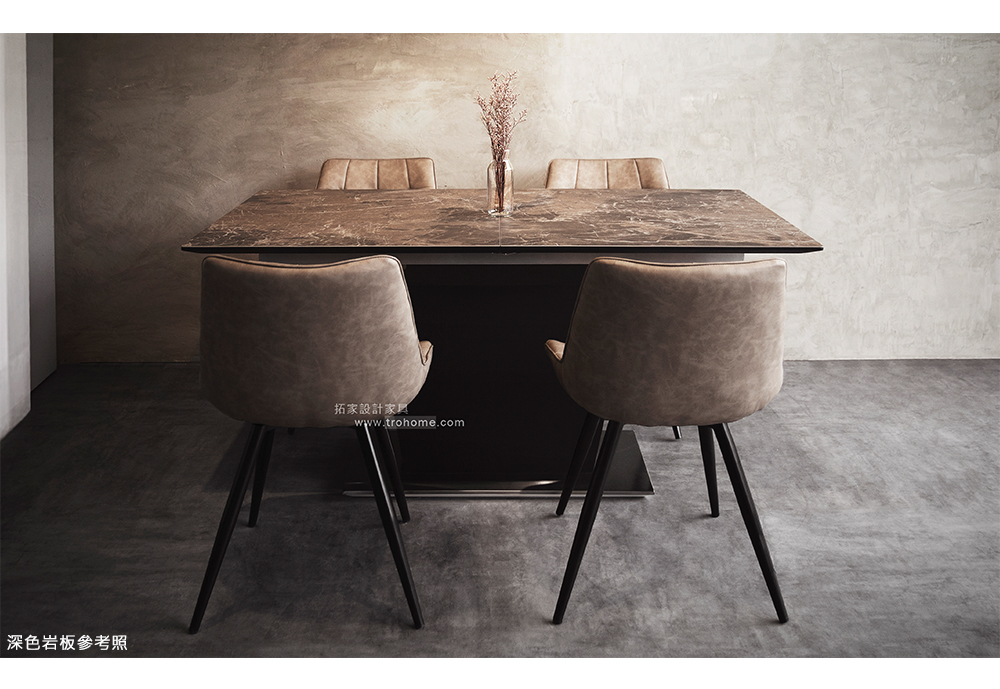 岩板桌面、MDF中密度纖維板貼木皮桌腳、不銹鋼底座