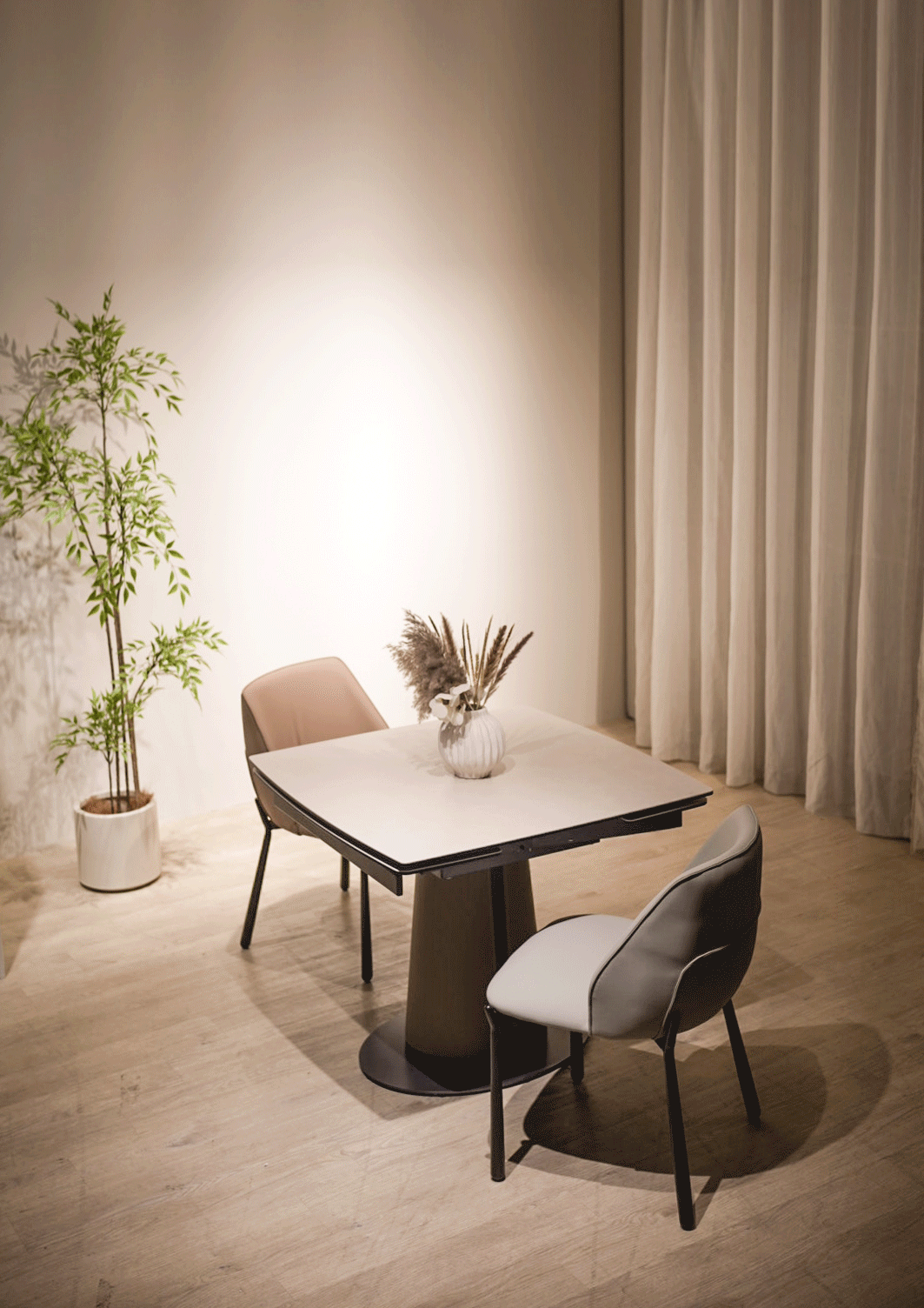 複合岩板,腳座使用不銹鋼材質包覆米色馬鞍皮